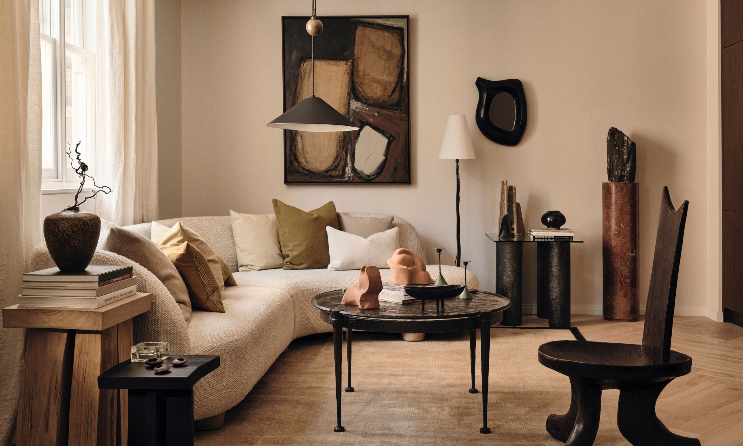 A curved sofa and natural wool and linen textiles soften the bolder elements in this living room. “I wanted to balance the boldness of the pieces with softness,” says designer Louise East.