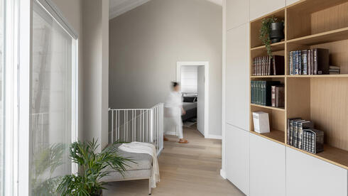 The living room parquet continues into the kitchen, creating a loft-like, open, and airy feel. For the observant family, the kitchen includes separate areas for meat and dairy preparation, with dual stovetops, ovens, and refrigerators. Double sets of utensils are stored in custom cabinets. The kitchen is entirely white with wooden accents matching the parquet and includes additional niches and cupboards integrating natural materials. A hidden door leads to a separate Passover kitchen, used only seasonally, maintaining design continuity with the main kitchen.