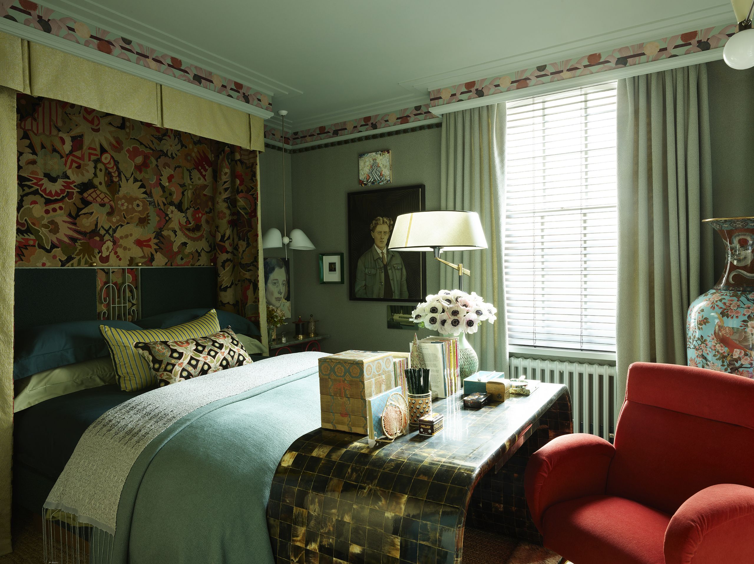 Colour plays a vital role, emanating from ‘a single anchor point’ in each room – the orange velvet of the reception room, tapestries lining the bedroom, and a grouping of Scandinavian ceramics in the bathroom.