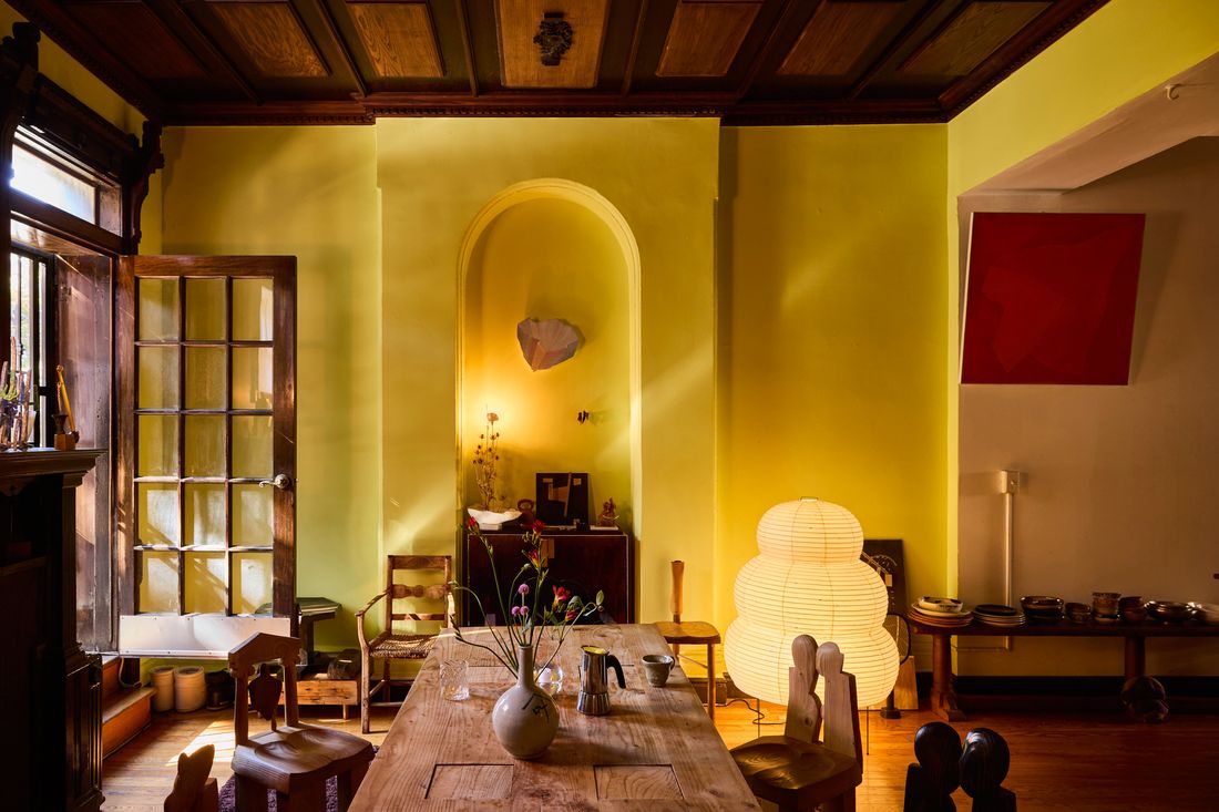The Dining Room Minjae Kim designed most of the furniture, including the Fish chair (far left), the Temple chair (left), the Kisser chair (right), and the Douglas-fir table. He calls the Akari floor lamp, by Isamu Noguchi, “Tomito.” The artworks in the niche and above the bench are by his mother, Myoung Ae Lee.